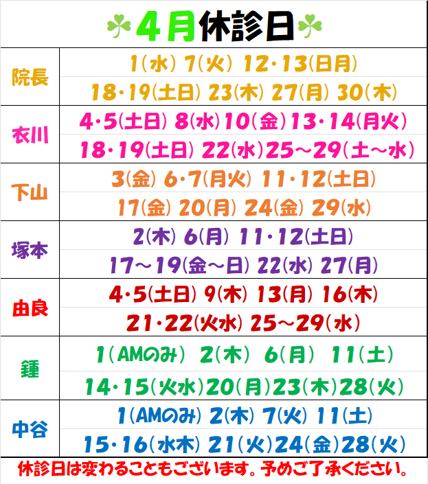お知らせ TOP新着情報一覧お知らせ先生の休診日 4月 先生の休診日 4月 2026.3.11 休診日は変更になる場合がございます。ご了承下さい。 担当医がお休みでも他の先生で拝見できる場合がございますので、一度お電話にてお問合せ下さい。 ご連絡お待ちしております。