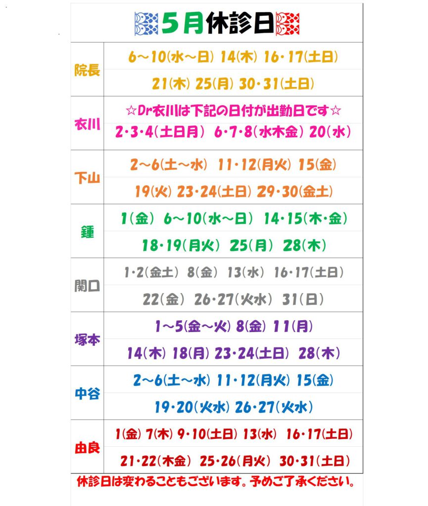 お知らせ TOP新着情報一覧お知らせ先生の休診日5月 先生の休診日5月 2026.4.15 休診日は変更になる場合がございます。ご了承下さい。 担当医がお休みでも他の先生で拝見できる場合がございますので、一度お電話にてお問合せ下さい。 ご連絡お待ちしております。